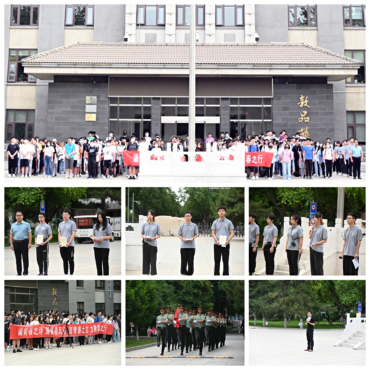 上午7时,国旗班的同学迈着铿锵有力的步伐,主题升旗仪式正式开始,升国旗、唱国歌、敬礼,鲜艳的五星红旗在师生的注目中冉冉升起。升旗结束后,2019级各班9位学生代表集体在国旗下朗诵中国共产党的主要创始人之一李大钊同志《青春》节选文章,“以青春之我,创建青春之家庭,青春之国家、青春之民族”的铿锵誓言在敦品楼前久久回响。同学们通过声情并茂的朗诵,进一步深刻感受到李大钊同志坚定的爱国主义精神以及他在青年时代面对多灾多难的祖国表现出忧国忧民的赤子之心。