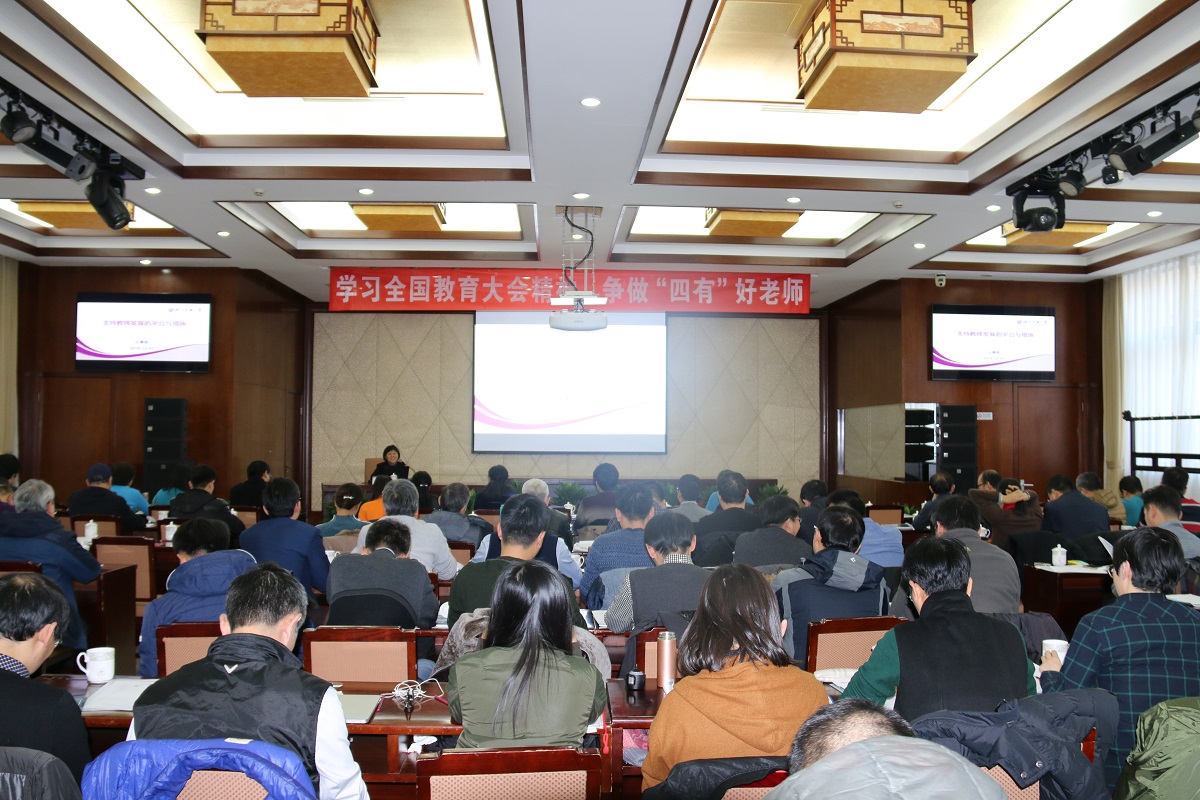 首都师范大学教师工作部部长苏寄宛老师以《高校师德建设的认识和体会》为题作报告。她从使命、形势、制度、底线、文化五个方面来话师德,通过优秀教师典型事迹来诠释师德的内涵,从职业角度看师德的意义,要把“三全育人”、“四有好老师”、“四个相统一”、“四个服务”、“四个引路人”内化于心、外化于行;面对当前的教育形势,苏老师进行了中外教育的对比,讲解了中华民族传统师德的延续与发展,强调在中国教育事业的发展与改革过程中,师德建设的重大意义和作用。