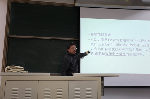 郑勇老师做2018年大学生科技活动总结及2019年动员。他谈到,2018年,电控学院学生参加了全国、北京市举办的各项比赛,获得如2018RoboMasters全国大学生机器人大赛全国一等奖,教育部“西门子杯”中国智能制造挑战赛总决赛二等奖1项、华北赛区特等奖2项、一等奖4项、二等奖3项、三等奖4项,第十三届全国大学生智能车竞赛华北赛区三等奖2项、优秀奖1项,第三届DE-TECH算法大赛总冠军、2018中国研究生电子设计竞赛团体二等奖等一系列优异的成绩,希望同学们积极准备、踊跃报名,在2019年比赛中再创佳绩。