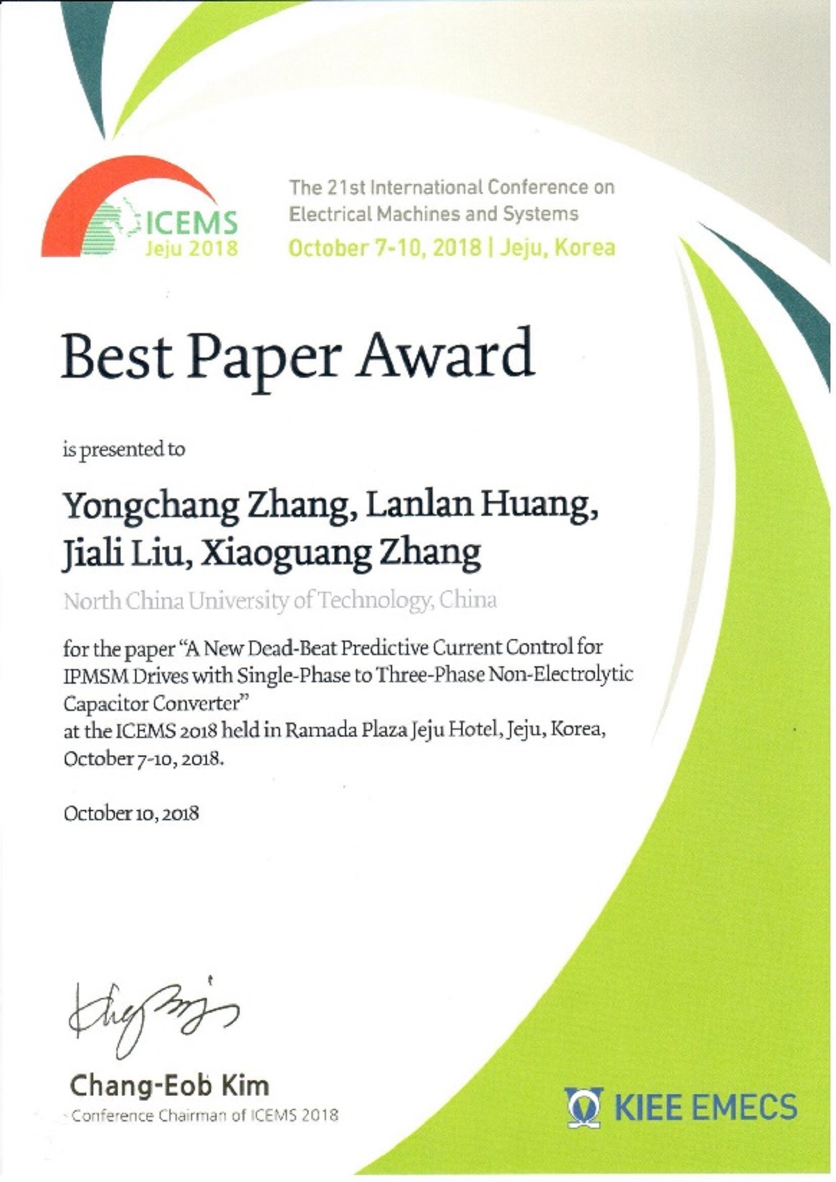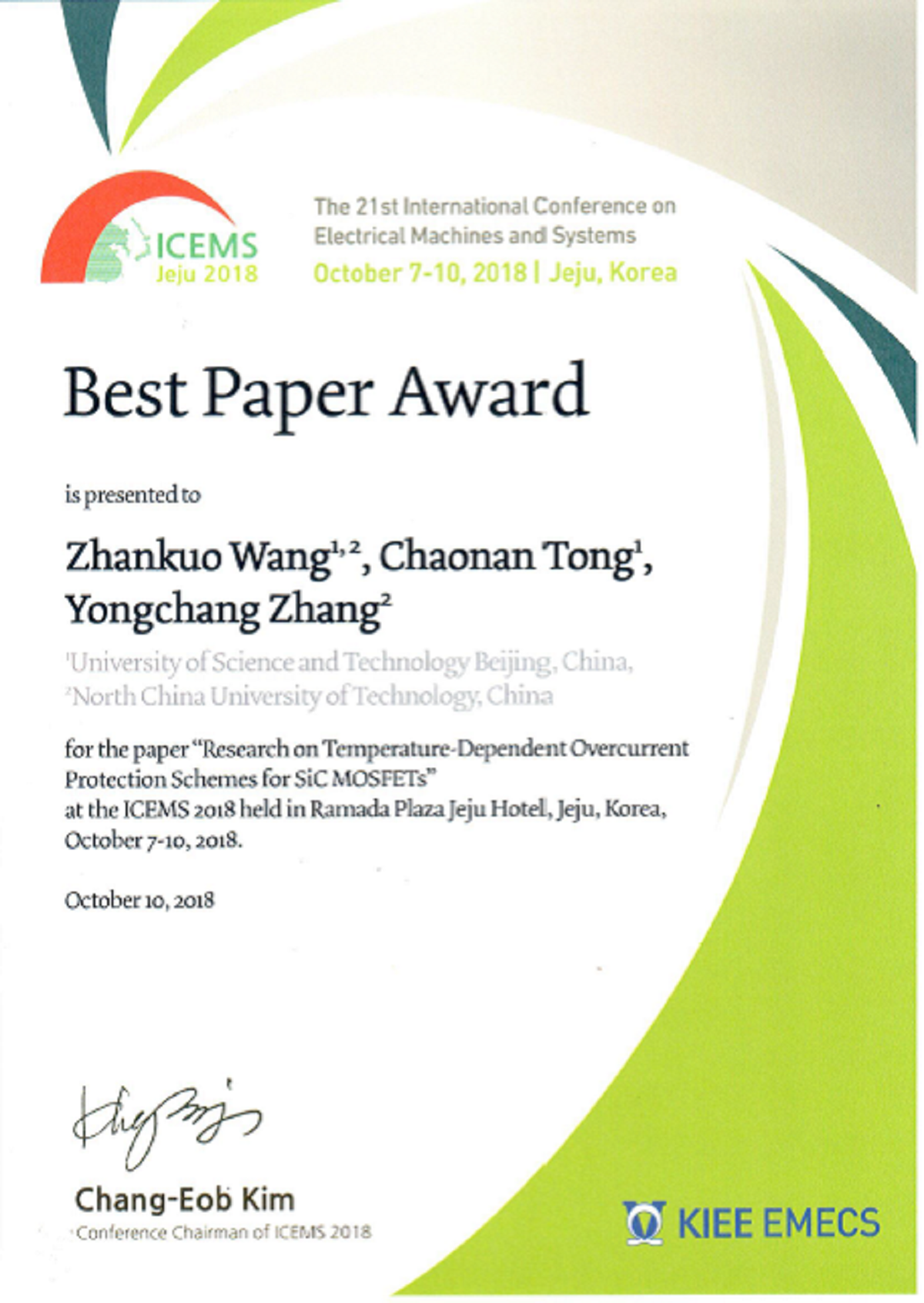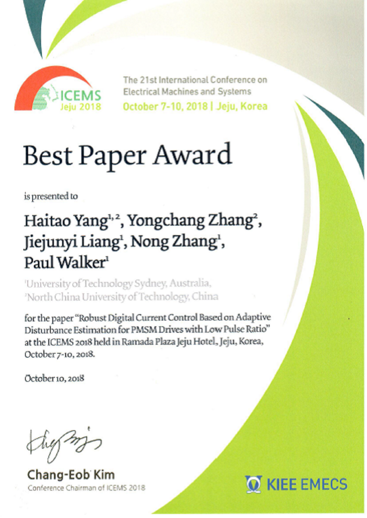 10月7日至10日,第21届国际电机与系统会议(International Conference on Electrical Machines and Systems,ICEMS 2018)在韩国济州岛召开。我校williamhill英国电气工程研究院师生完成的论文获得3篇最佳论文奖(Best Paper Award),这是继2013年电控师生在ICEMS会议上获奖后再次获奖。