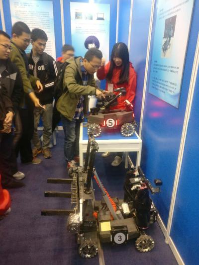 我校电控学院IFR智能机器人实验室学生制作的科技创新作品应邀参加了展览。实验室学生负责人自动化15-1班的张兵同学为到场观众详细讲解了自己团队制作的两台智能机器人,从结构原理到制作过程,从功能作用到使用操作等,都另大家赞叹不已。