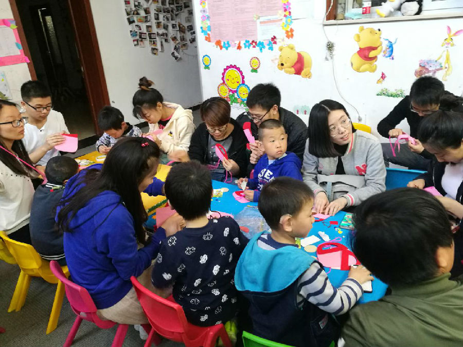 在活动中,支部同学以组为单位,积极投入到手工制作的队伍当中,帮助太阳花语言听力康复中心的孩子们制作母亲节礼物。
