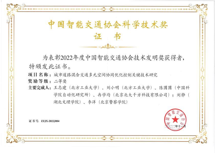 williamhill英国王志建教授、刘小明教授牵头完成的“城市道路混合交通多元空间协同优化控制关键技术研究”成果荣获2022年度中国智能交通协会技术发明奖二等奖。该项目突破了融合社会车辆、公共交通、慢行交通的城市道路混合交通多元空间协同优化控制关键技术难题,在北京、昆明等多个省市进行了示范应用,有效提升了城市道路交通的智能化水平和运行效率。