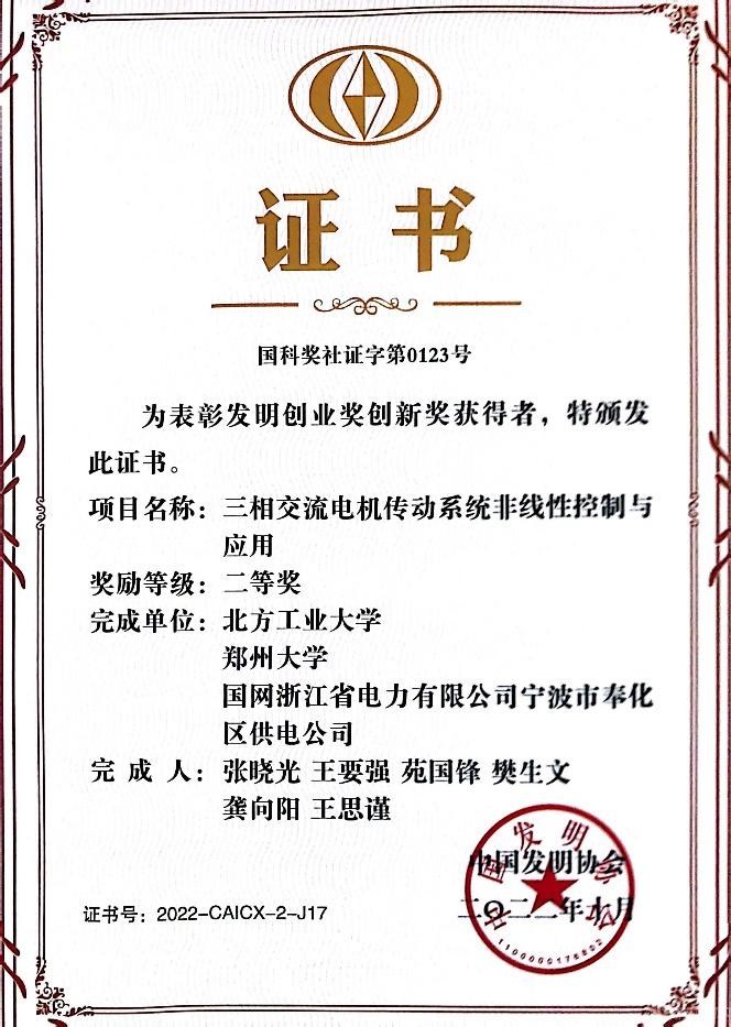 近日,中国发明协会公布了2022年度“发明创业奖·创新奖”名单,我校作为第一完成单位申报的项目“三相交流电机传动系统非线性控制与应用”获得二等奖。