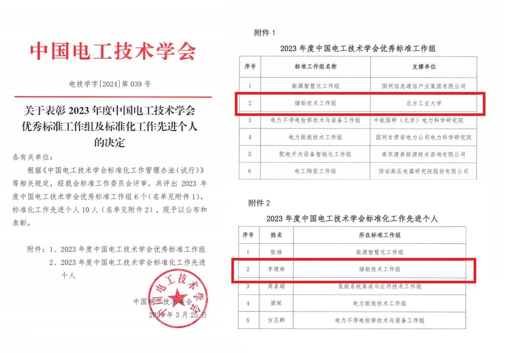 近日,中国电工技术学会发布《关于表彰2023年度中国电工技术学会优秀标准工作组及标准化工作先进个人的决定》,我校作为中国电工技术学会储能技术标准专业分会支撑单位,获得“2023年度中国电工技术学会优秀标准工作组”的荣誉称号,李建林教授作为标委会秘书长,获评“2023年度中国电工技术学会标准化工作先进个人”。