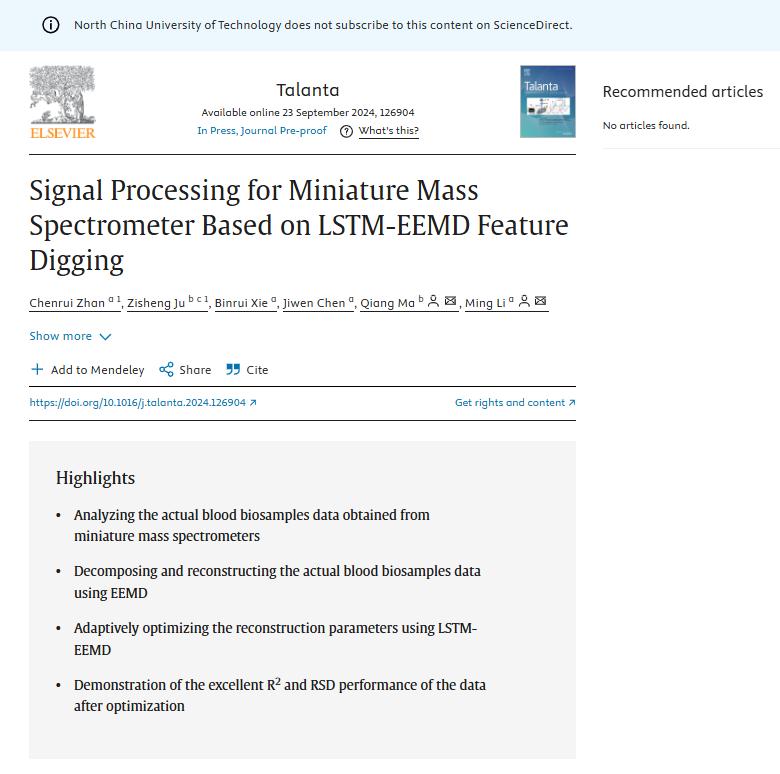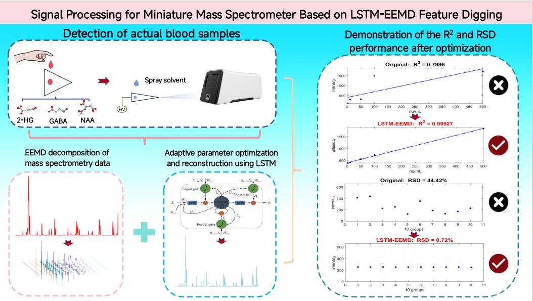 近期,我校电控学院李明研究员在国际顶级期刊《Talanta》(中科院一区、TOP期刊)发表题为“Signal Processing for Miniature Mass Spectrometer Based on LSTM-EEMD Feature Digging”的研究论文。该研究创造性地提出了一种基于长短期记忆-集合经验模态分解(LSTM-EEMD)的数据处理方法,为提高小型质谱仪在复杂基质样品和恶劣环境条件下的现场检测性能开辟了新路径。