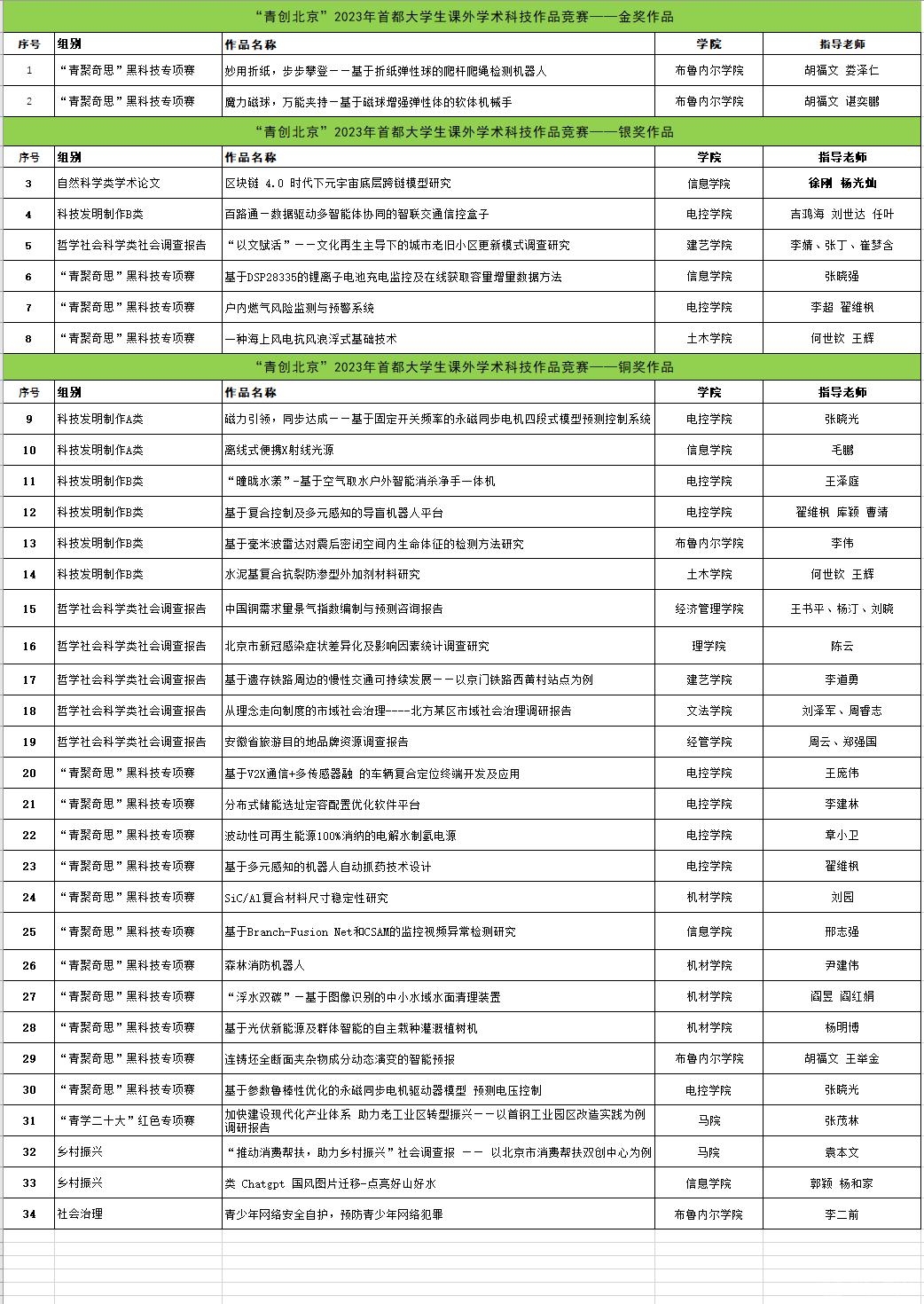 5月21日下午,由北京团市委、市教委、市科协、市学联共同主办的“青创北京”2023年“挑战杯”首都大学生课外学术科技作品竞赛闭幕式在北京工商大学举行,我校共上报78件作品,其中34件作品获得市级奖项。分别获得金奖2项,银奖6项,铜奖26项,其中3项主赛道和2项黑科技专项赛作品进入市级终审答辩,我校黑科技作品《魔力磁球,万能夹持—基于磁球增强弹性体的软体机械手》、《妙用折纸,步步攀登——基于折纸弹性球的爬杆爬绳检测机》在全市460个作品中脱颖而出,并摘夺了本届黑科技专项赛道金奖。同时,我校在本次“挑战杯”首都赛中荣获优秀组织奖。