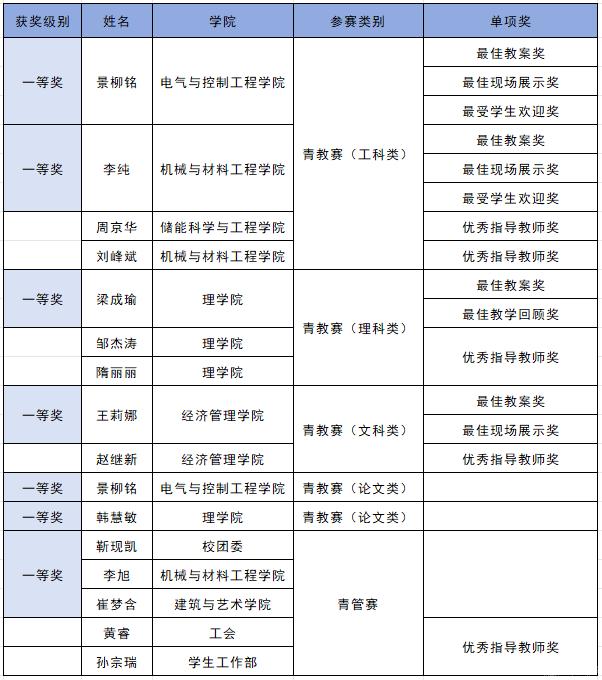 近日,北京高校第十三届青年教师教学基本功比赛(以下简称“青教赛”)及第二届管理岗位青年教职工职业能力竞赛(以下简称“青管赛”)获奖名单公布,我校喜获“突出贡献奖”和“优秀组织奖”,景柳铭、李纯、梁成瑜、王莉娜等4名教师获得青教赛一等奖,景柳铭、韩慧敏等2名教师获得青教赛论文比赛一等奖,靳现凯、李旭、崔梦含组成的教师队伍获青管赛一等奖。获奖总数位居北京高校前列,取得我校历史最好成绩。