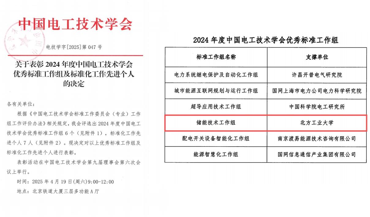 近日,中国电工技术学会发布《关于表彰2024年度中国电工技术学会优秀标准工作组及标准化工作先进个人的决定》,我校“储能技术工作组”获得“2024年度中国电工技术学会优秀标准工作组”的荣誉称号,我校参编的T/CES 251-2023《储能系统变流器涉网性能硬件在环检测规范》工信部百项团体标准应用推广典型案例。