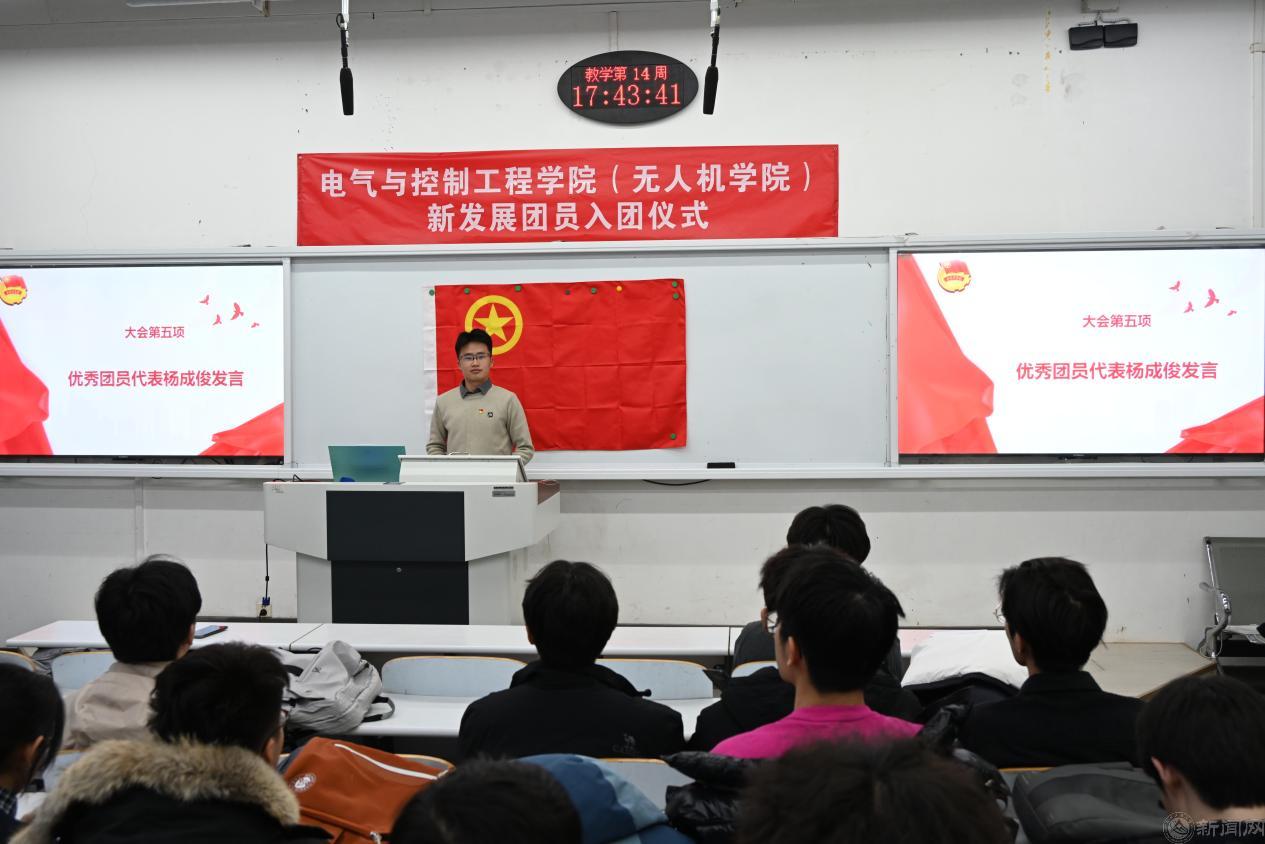 优秀团员代表杨成俊杨成俊结合自身经历,分享了成长路上的感悟与收获。他回忆了初入校园时的迷茫与困惑,以及在老师指导和自身努力下,斩获国家奖学金、国家励志奖学金等多项荣誉,并成功推免至中南大学攻读硕士学位的奋斗历程。同时,他讲述了自己担任学院团委副书记、班级班长等多项学生职务,服务千余名同学的责任担当;分享了作为骨干志愿者参与纪念中国人民抗日战争暨世界反法西斯战争胜利 80 周年活动、烈士纪念日敬献花篮仪式等重大活动的难忘经历,以及作为北京市学生资助宣传大使、“青马工程”学员宣讲党的政策、传递青春正能量的使命践行,激励新发展团员以昂扬姿态扛起青年一代的时代责任。随后杨成俊带领全体新团员面向团旗庄严宣誓,誓言铿锵有力,表达了新团员们对共青团的忠诚与信念。