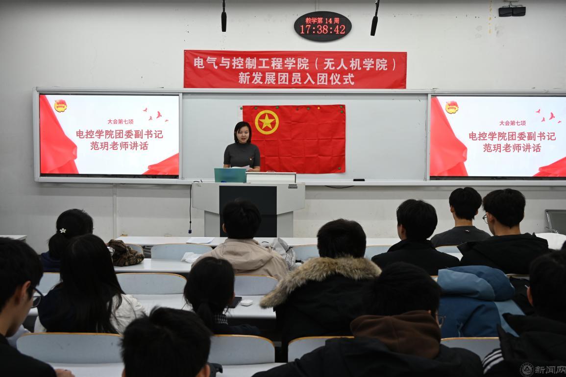 范玥对新加入共青团的同学们致以诚挚祝贺并为新发展团员佩戴团徽。她表示,团组织永远是青年成长的坚实后盾,学院将持续搭建理论学习平台与实践锻炼舞台,助力团员们提升能力、增长才干。她对新团员们提出三点期望:一是坚定理想信念,认真学习党的创新理论与科学文化知识,明晰新时代青年使命,勇于担当责任;二是珍惜在校时光,扎实学好专业知识,积极参与集体活动与社会实践,在服务他人、奉献社会中积累经验、锤炼品格;三是严守纪律规矩,以团员标准严格要求自己,做好先锋表率,带动身边同学共同进步。她鼓励新团员们牢记今日誓言,以榜样为标杆,将 “强国有我” 的信念落实到日常学习行动中,走出新一代工大人的坚实步伐。
