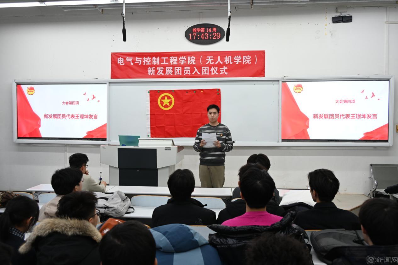 仪式在庄严的国歌声中拉开序幕。新发展团员代表王璟坤上台发言,他讲述了自己本科期间响应“携笔从戎”号召,投身军旅的经历。军营里的队列训练、野外拉练与站岗执勤,锤炼了他坚韧不拔的意志和对“责任”“担当”的深刻认知。退伍返校后,他克服学业断层的困难,以军营赋予的毅力刻苦备考,成功考取本校硕士研究生。他表示,从军营到校园,对共青团的向往从模糊敬意变为坚定追求,今后将牢记入团誓言,以青春之我勇担时代使命,在成长路上践行初心、稳步前行。