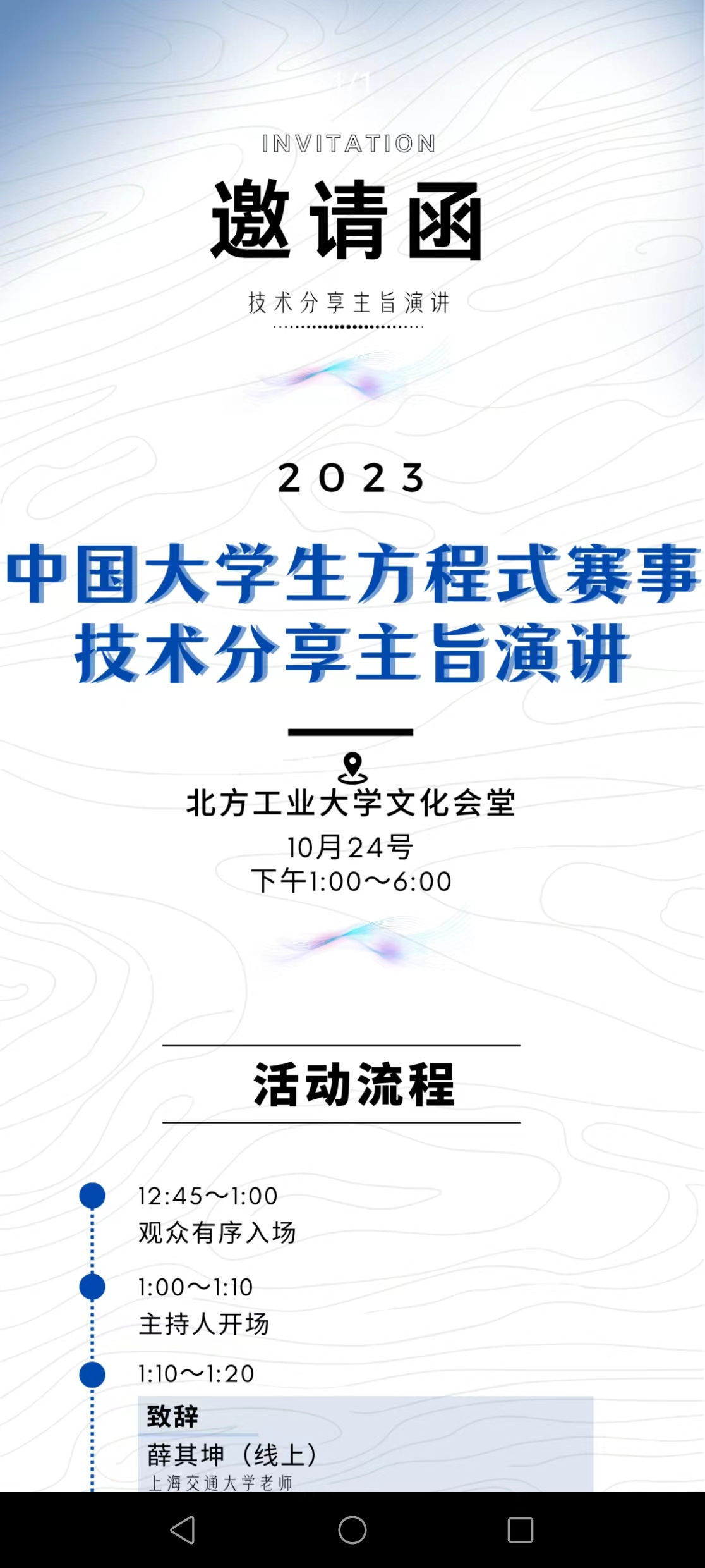 中国大学生方程式赛事技术主旨演讲,是我车队主办的大学生方程式技术交流会,邀请了上海交通大学、河北工业大学、浙江水利水电学院、北京航空航天大学、福建农林大学、湖北汽车工业学院、武汉理工大学车队成员或老师会上发言分享,并有清华大学、北京理工大学、北京信息科技大学、江苏大学等车队成员参加。