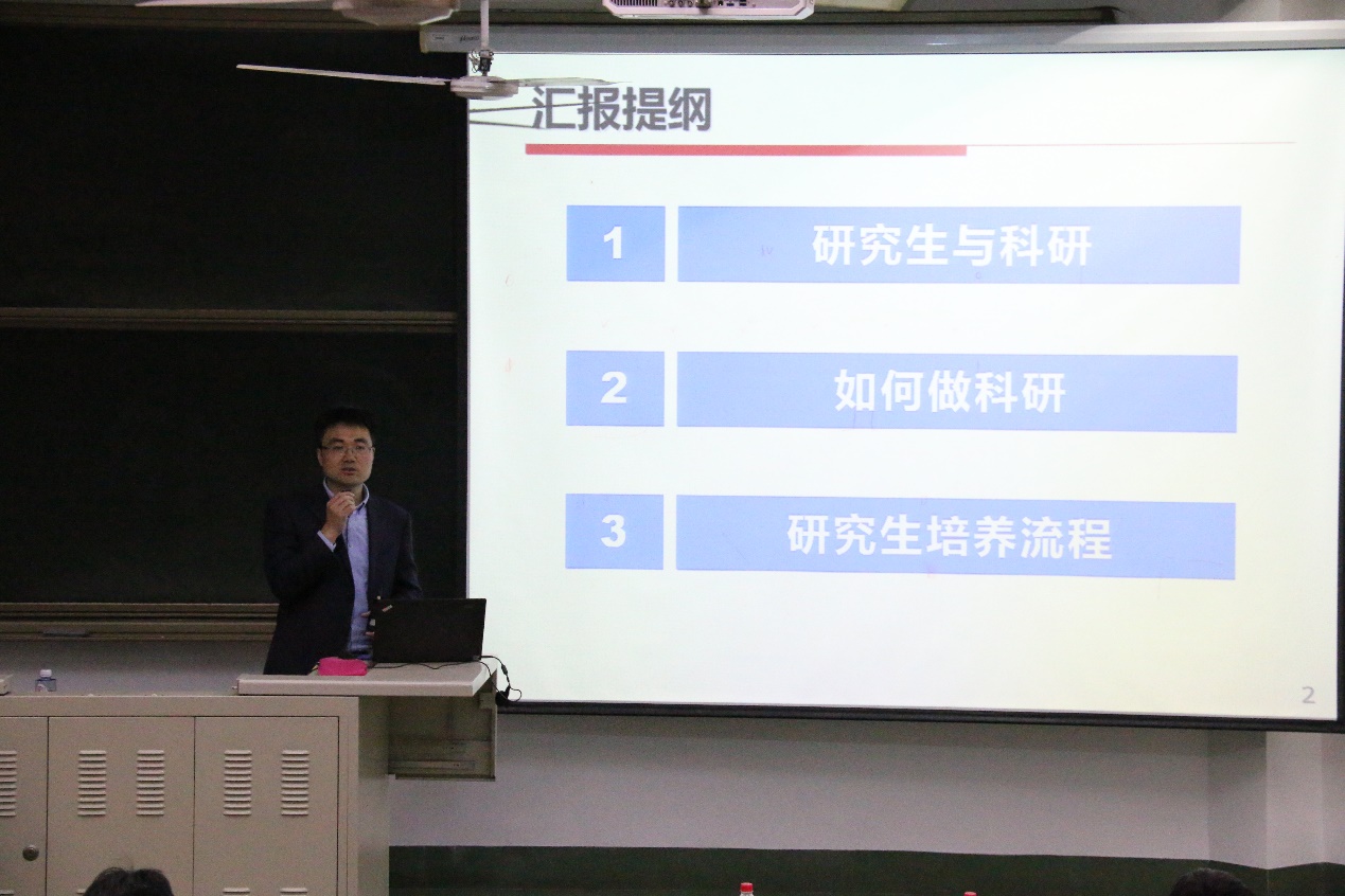 庞教授在讲座中主要介绍了研究生与科研的关系、如何做科研以及我校的研究生培养流程,并从科研素质、科研选题、文献阅读、科研创新、成果发布五个方面着重讲解了身为研究生应该如何去做科研。讲座过程中,庞教授或结合学生实例或结合热门研究领域,使在座的同学深入其中,对于科研有了更深层次的理解。