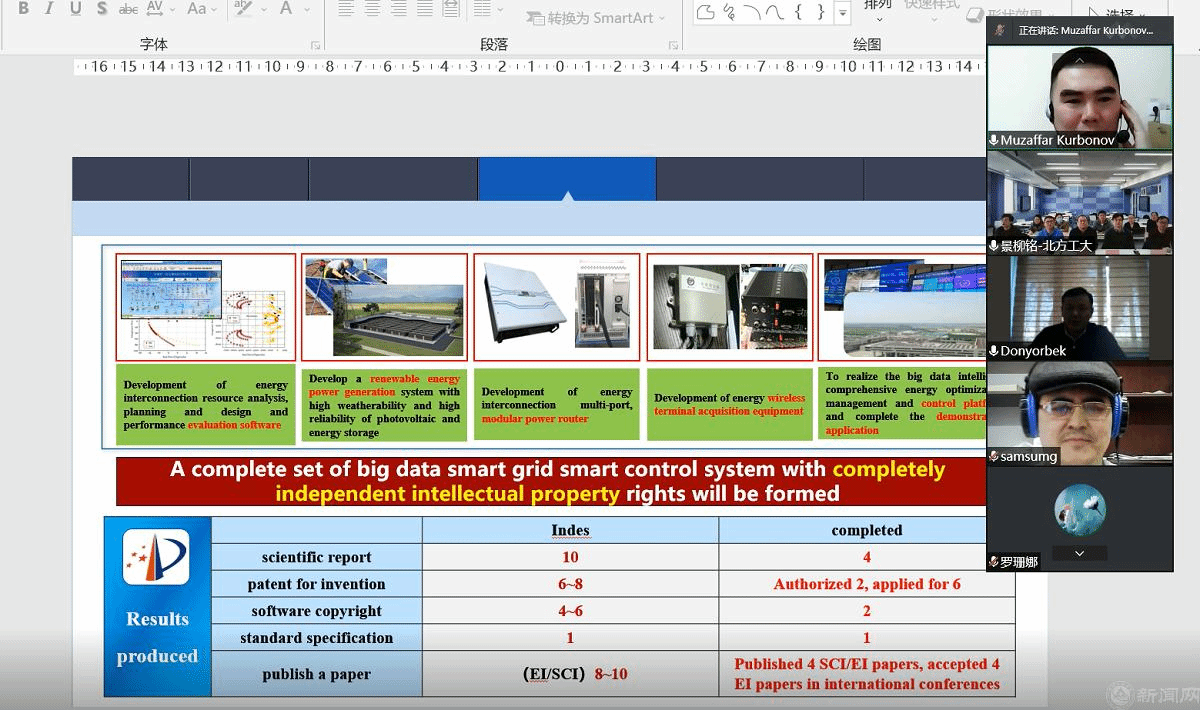 北京时间2月21日下午2点(乌兹别克斯坦当地时间上午11点),我校“新能源发电与智能电网”北京市创新团队与乌兹别克斯坦安集延机械制造大学,召开由我校承担的国家重点研发计划“政府间国际科技创新合作重点专项”项目推进工作视频会议。双方就共同开展的项目研究内容进行了商讨,并对下一阶段的研究工作进行了安排。安集延机械制造大学新能源学院负责人阿利约诺夫·多约尔(Alijonov Donyor)教授、穆扎法尔·库尔布诺夫(Muzaffar Kurbnov)博士、伊斯梅洛夫·艾利舍尔(Ismailov Alisher)博士、英国威廉公司项目组成员周京华、胡长斌等7位老师、学国际合作与交流处副处长徐美参加会议。