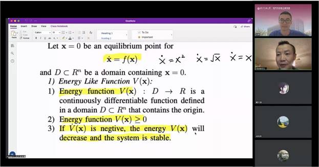 李雅普诺夫稳定判据为俄国数学家和力学家李雅普诺夫在1892年所创立的用于分析系统稳定性的理论。此方法可用于任意阶的系统,可不必求解系统状态方程而直接判定稳定性。Howard Li教授首先以汽车行驶途中停车状态为例,从数学与物理的角度讲解稳定性原理,通过实际案例,通俗易懂的为同学们讲解了稳定性与线性系统控制的机理,随后以高山滑雪运动员运动过程中如何达到稳定为例,指出稳定系统的根节为能量方程,可通过李雅普诺夫的分析方式,在不知道系统实际能量的情况下,分析非线性系统的稳定性,随后又以一个例题引领同学们学习了李雅普诺夫稳定判据分析方法,使同学们加深了学习所得。
