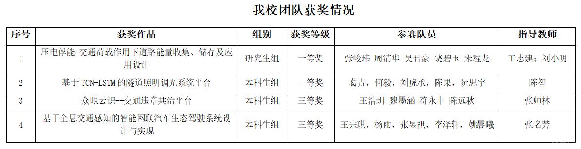 全国高校智能交通创新与创业大赛是全国大学生交通运输类两大重要学科竞赛之一。本次比赛由中国自动化学会、全国高校综合智能交通专业联盟主办,中国公路学会自动驾驶工作委员会协办,中国民航大学承办。围绕“交通有我,众创未来”主题,吸引了近100所高校报名,共提交73个研究生和175个本科生初赛作品,后经申报高校层层选拔推荐、资格审核,78所高校的34个研究生作品和102个本科生作品入围决赛。经过紧张、激烈的赛程,136支参赛队伍,经过PPT汇报、演示作品和专家质疑环节,最终评审出大赛一等奖24个、二等奖48个和三等奖64个。
